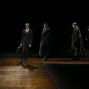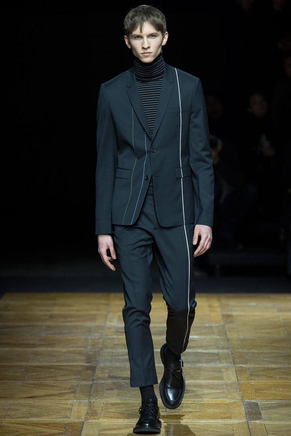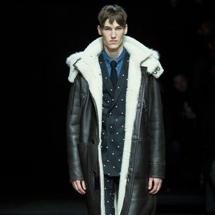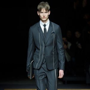 Manipulating a formal attitude for the man who knows how to dress to the nines, but also values confident casual essentials, Dior Homme creative director Kris Van Assche sent a well-rounded fall/winter 2014 collection down the runway. With sprigs of Lily of the Valley worn in suit pockets, later to become a significant graphic, pinstripes dressed the season’s initial tailored selection, transitioning into a fun divergence of polka dots.