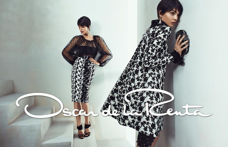 For his spring-summer 2014 campaign, Oscar de la Renta enlists Emily di Donato and Kate Bogucharskaia for his new advertisements. The duo wears matching short hairdos in the pastel separates and pretty gowns in images by Norman Jean Roy. Stylist Natasha Royt worked on the shoot with hair by Esther Langham and makeup by Gucci Westman.
