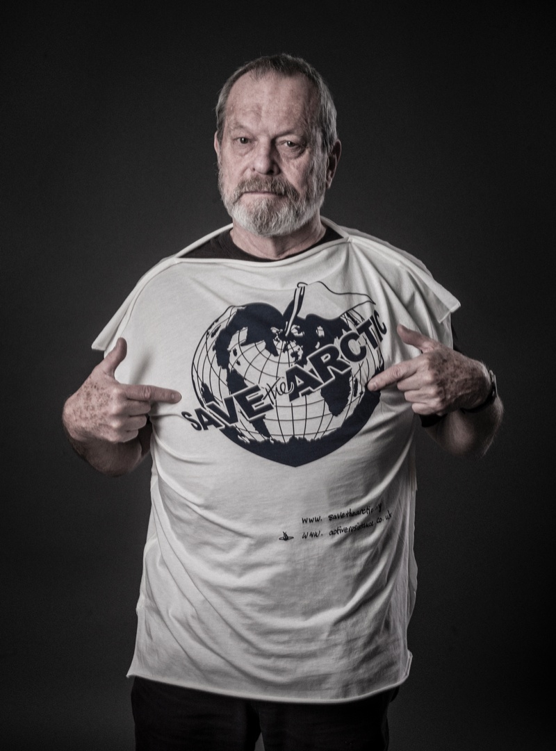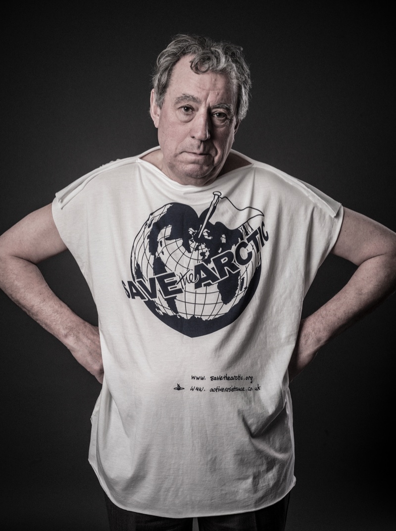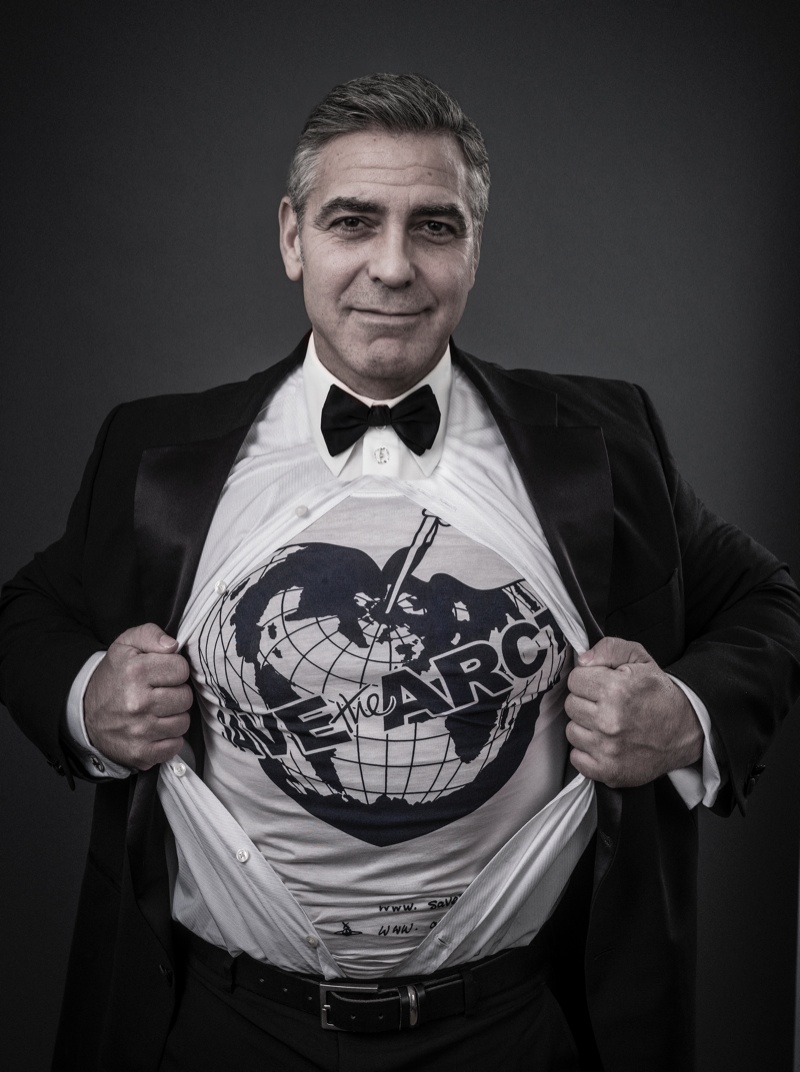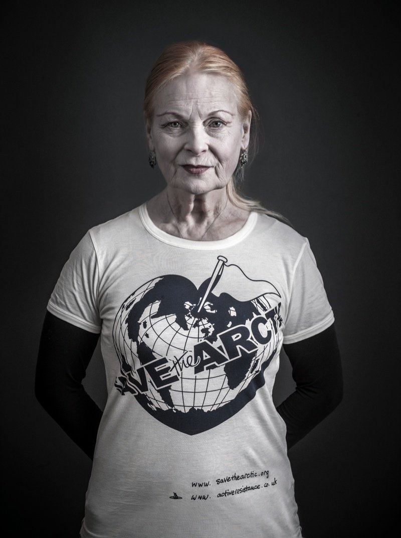Greenpeace’s latest campaign championing the Arctic and its preservation was launched at Vivienne Westwood’s Gold Label spring/summer 2014 show with her Save the Arctic logo. Westwood collaborated with celebrity photographer Andy Gotts MBE for portraits featuring actor George Clooney, Coldplay frontman Chris Martin, Terry Jones and Terry Gilliam of Monty Python plus more. Discussing her choice to work with Gotts, Westwood shared, “Andy is popular with celebrities because he makes it all a pleasant experience.” She added, “Celebrities are often the key to getting a message across. Public opinion is very responsive to celebrity.”
