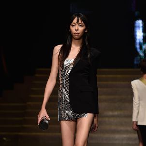 The designer presented the revised interpretation of his renowned collection such as 80s-inspired girdle looks and the bold colourful pinstripes were among the strongest and iconic where it preoccupied in shorts, lop-sided suits and abbreviate jackets. The menswear tuxedo jackets were dissevered and mixed up with shimmery silver disco minidresses were classy and devoid of extraneous detail.