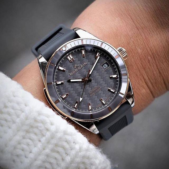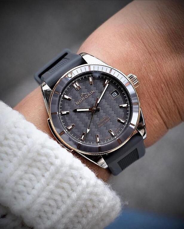 Introducing the Norqain Adventure Sport 37mm Grey & Gold This wastimepiece has a scratch-resistant grey ceramic bezel with the special NORQAIN pattern dial.