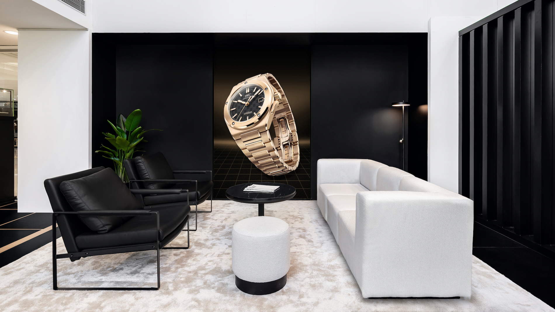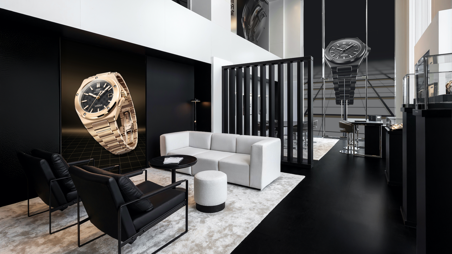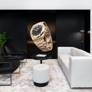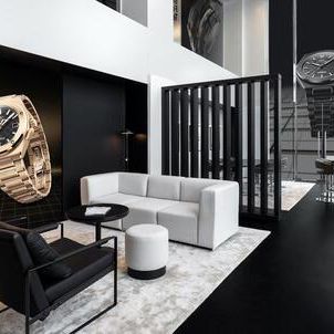 The architectural design itself is a nod to the newest timepieces, featuring elegant black and gold accents that echo the latest models crafted in black ceramic and gold.