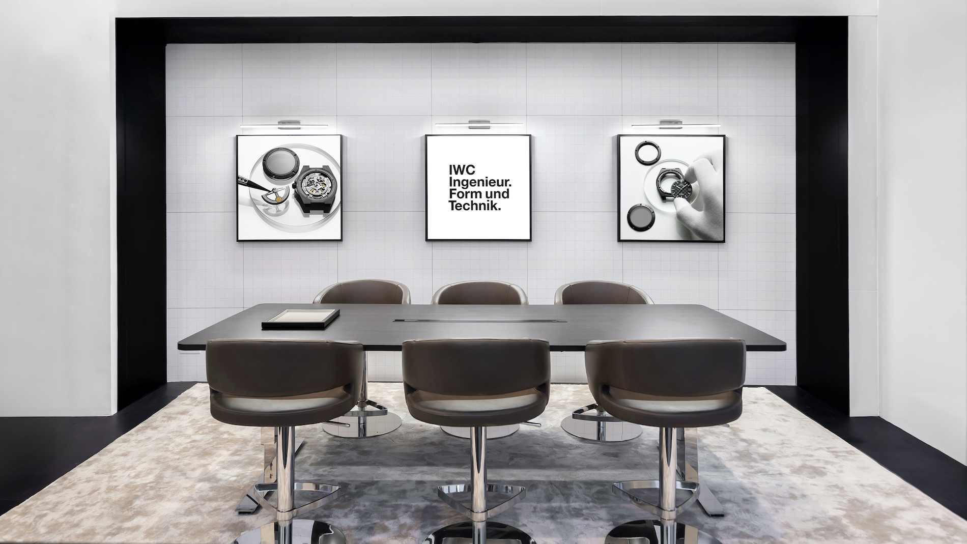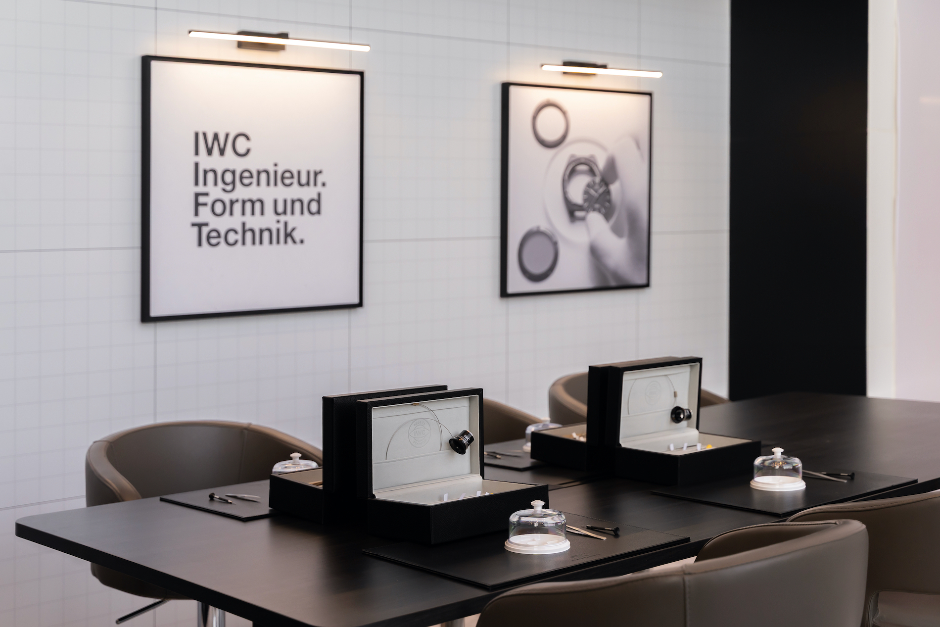 Beyond the showcase, the space serves as a hub for engagement, featuring a long table at the rear dedicated to watchmaking workshops and interactive activations, underscoring IWC's commitment to education.