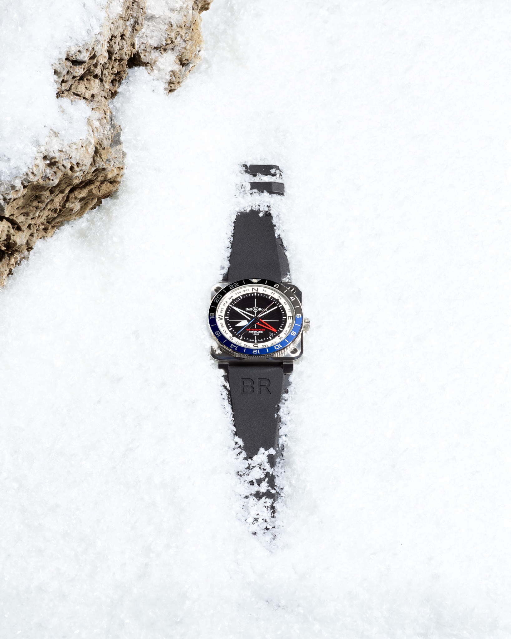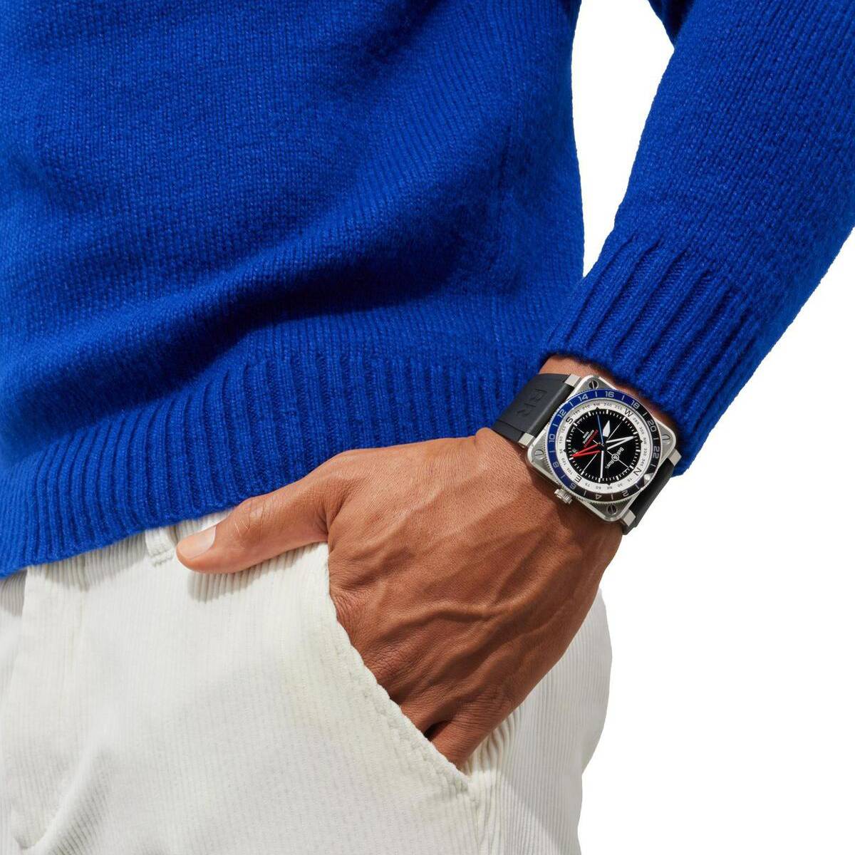 Designed as the quintessential travel instrument, this robust watch allows for the instant, effortless reading of two time zones—a must for the global jetsetter. The signature 42 mm square case—a bold, architectural hallmark of Bell & Ross—frames a high-performance dial. Topped with a striking round bezel crafted from 24-hour graduated anodized-aluminium—chicly rendered in split blue for day and black for night—this watch is as functional as it is fashionable.