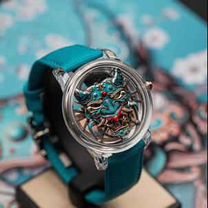 Jaquet Droz called upon a team of master craftspeople including engravers and painters to achieve this level of detail. The main surface is hand-painted while the horns are crafted from translucent enamel. In a premiere for the brand the face features a setting of Murano glass beads that accentuate the dominant jade color and the menacing red accents found on the hands. Intaglio engraving on a red gold base underscores the eyes and mouth to ensure that none of the surfaces remain flat.