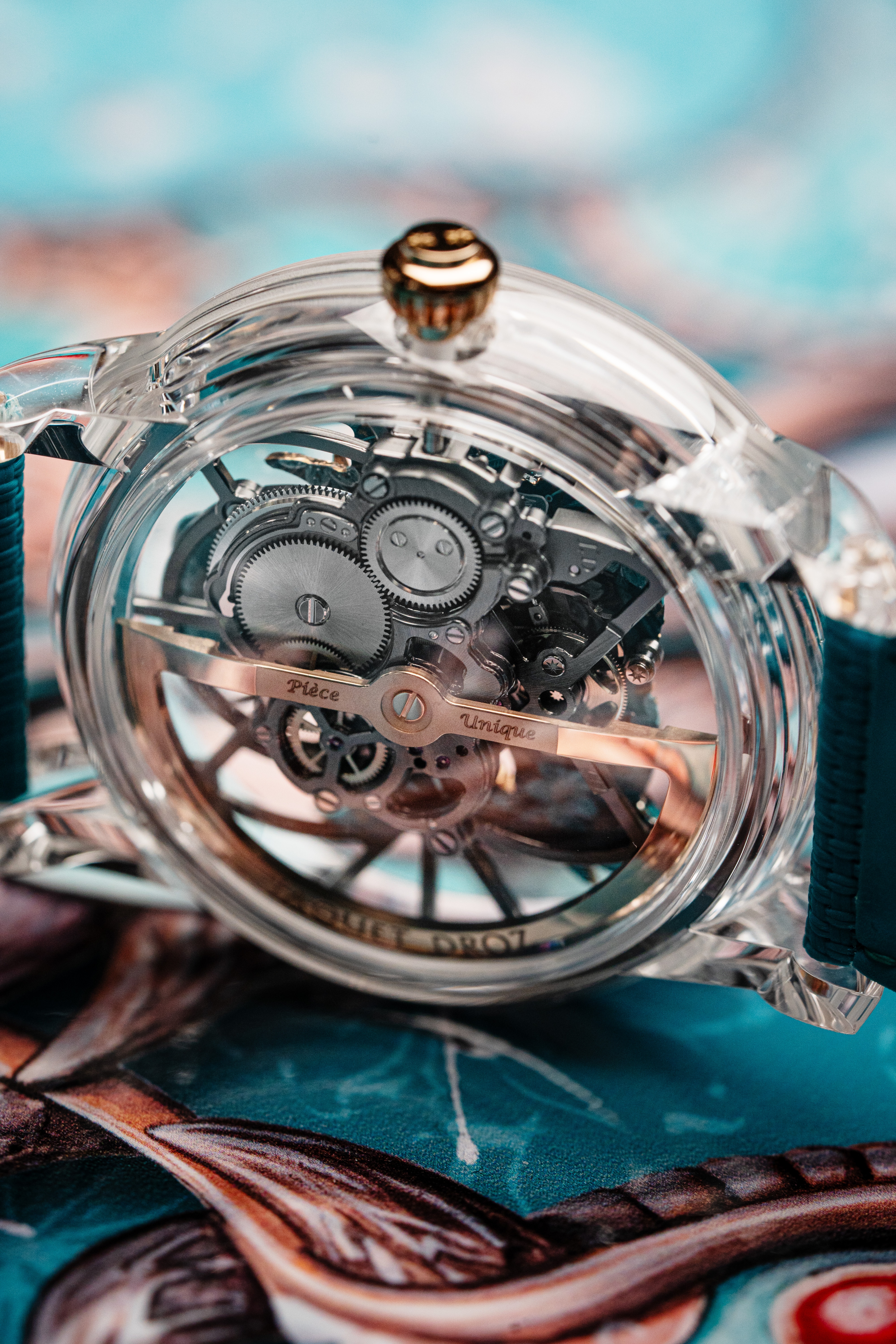 The visual impact is immediate as micro-sculpture takes center stage to ensure the mask emerges in three distinct dimensions. A 100 percent sapphire case creates a spectacular illusion that the mask is being worn directly on the wrist. This transparent housing is a tour de force that is manufactured entirely in La Chaux-de-Fonds without the use of screws or inserts. The result is a perfectly clear and unobstructed view that allows the most intricate details of the craftsmanship to be admired from every angle.