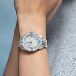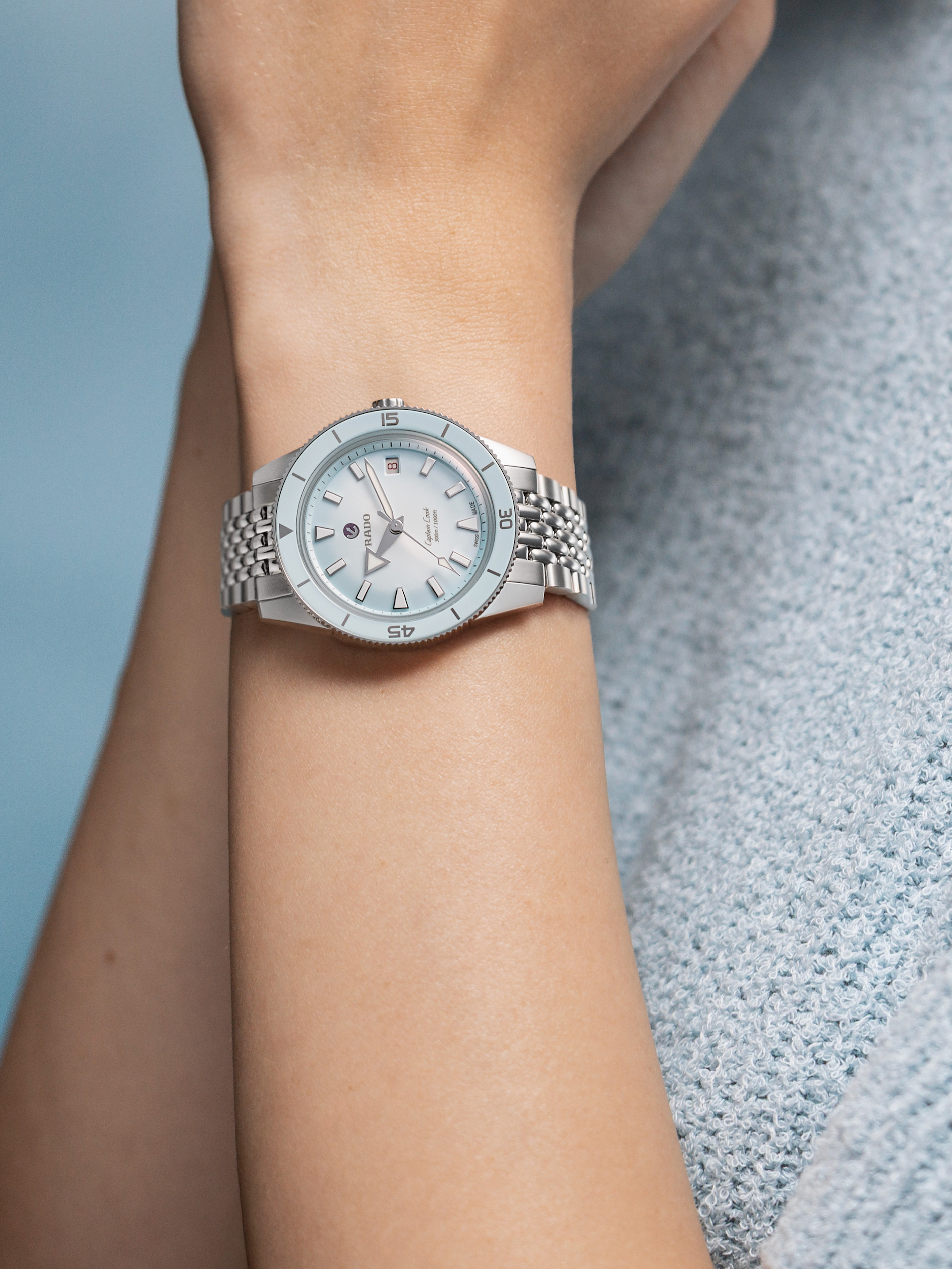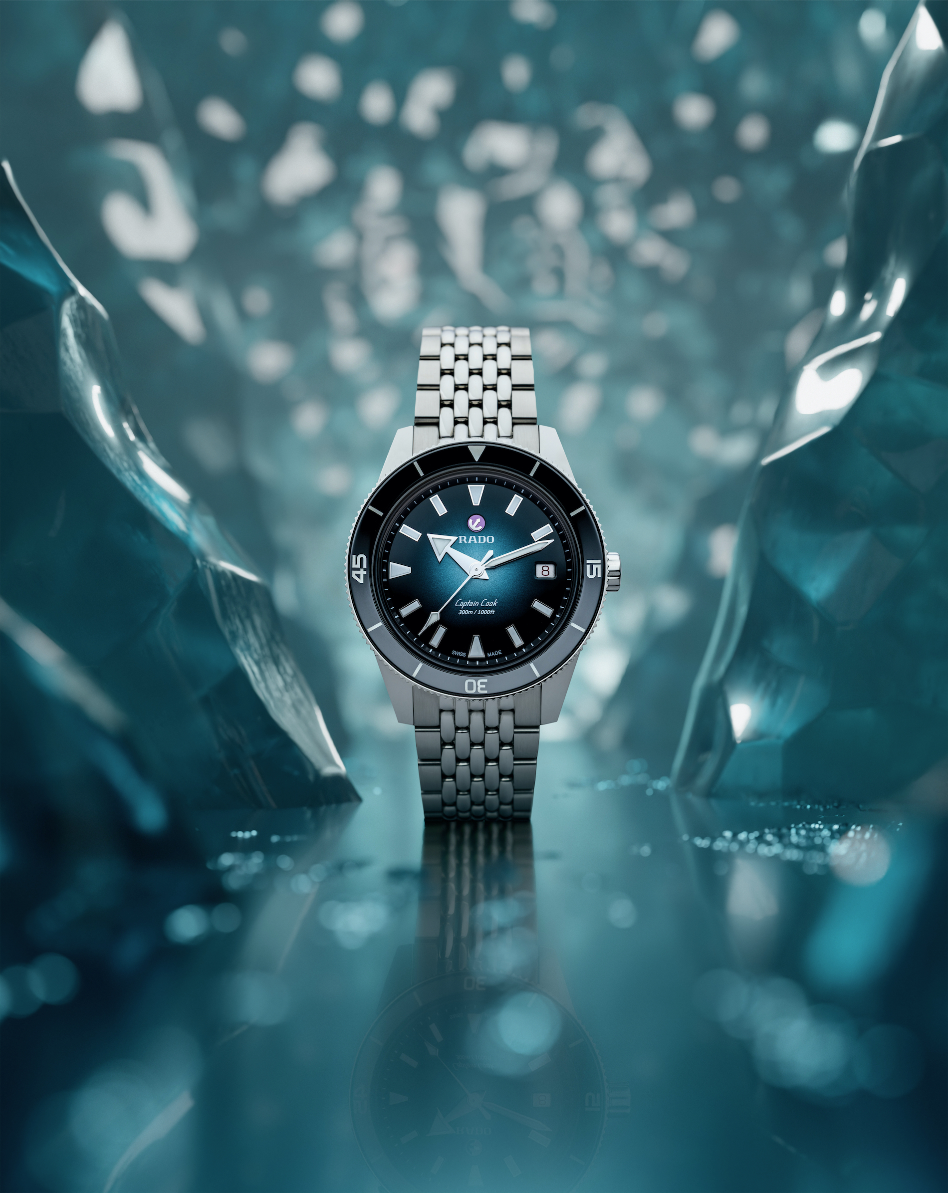 Discover two new Rado Captain Cook models designed to channel the ocean's most evocative colours for the ultimate summer statement. These horological companions serve as the perfect partners for a day at the beach club or cocktail hour on a yacht. The first model radiates immaculate summer holiday vibes with a light blue-to-white dial and light blue ceramic bezel insert. This spectrum is a first for Rado and instantly transports the wearer back to St Barts or a honeymoon bungalow in the Seychelles. It captures the essence of pure cloudless skies reflecting on warm shallow waters for a care-free escape from real life.