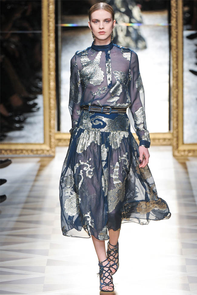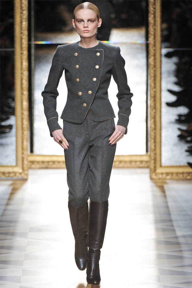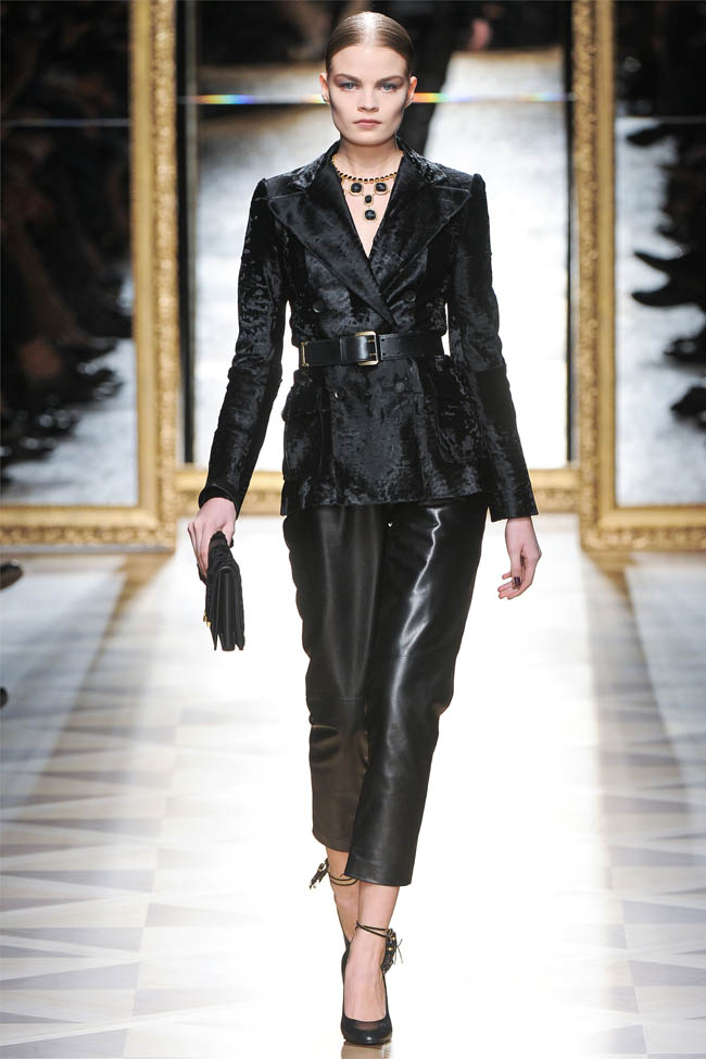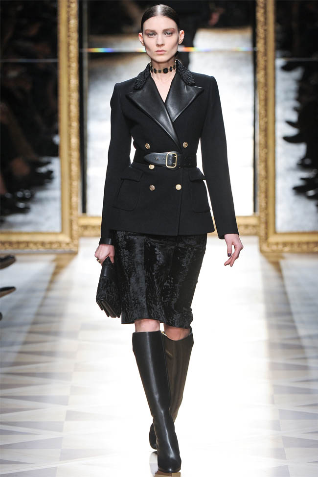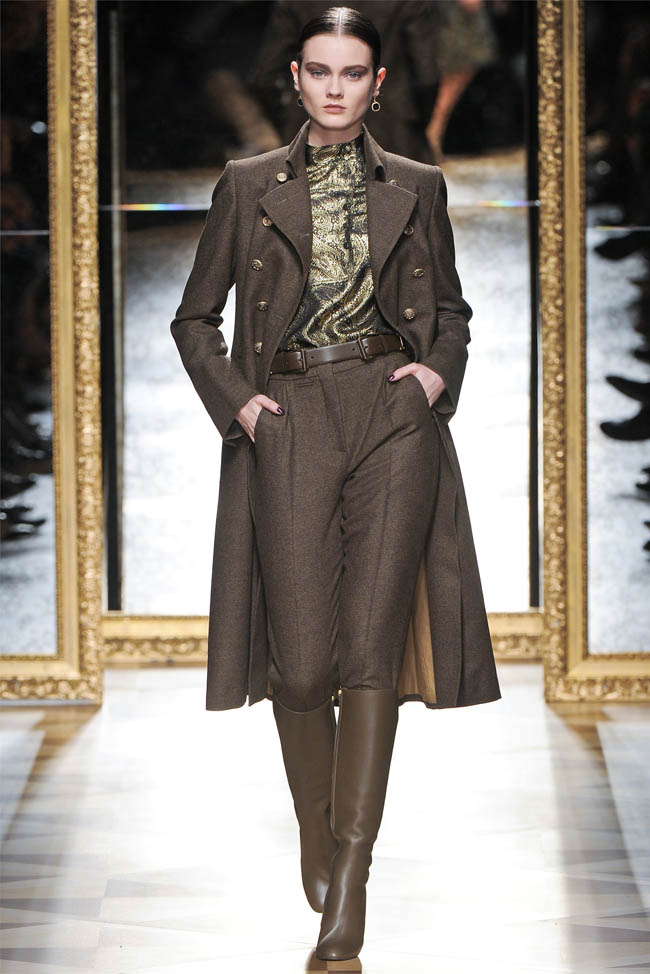 Salvatore Ferragamo's Fall/Winter 2012/2013 womenswear fashion show in Milan's Women's Fashion Week started with a parade of gold-buttoned double-breasted military coats and ended in a waltz of romantic evening gowns.