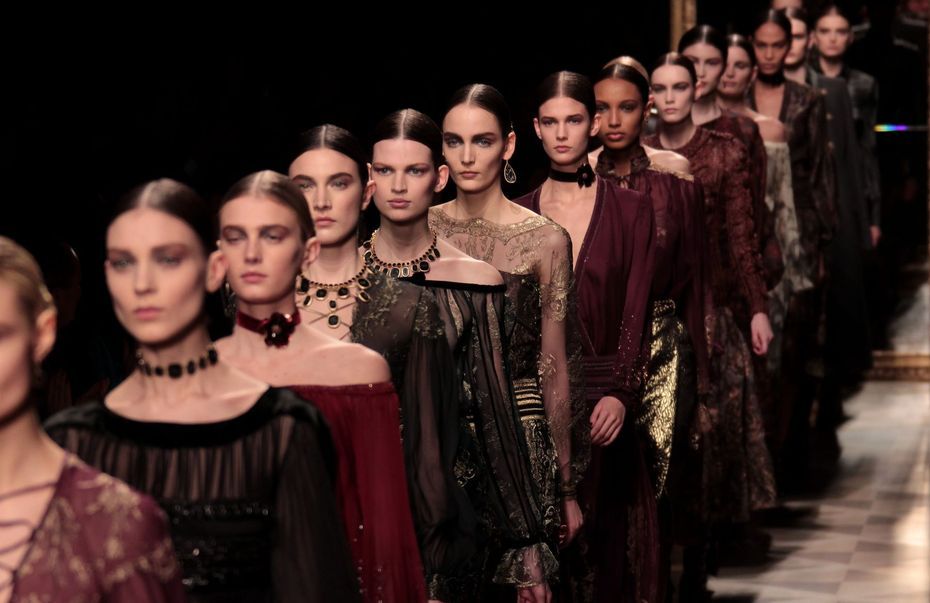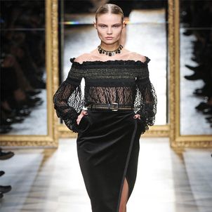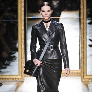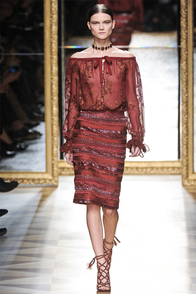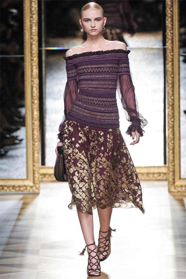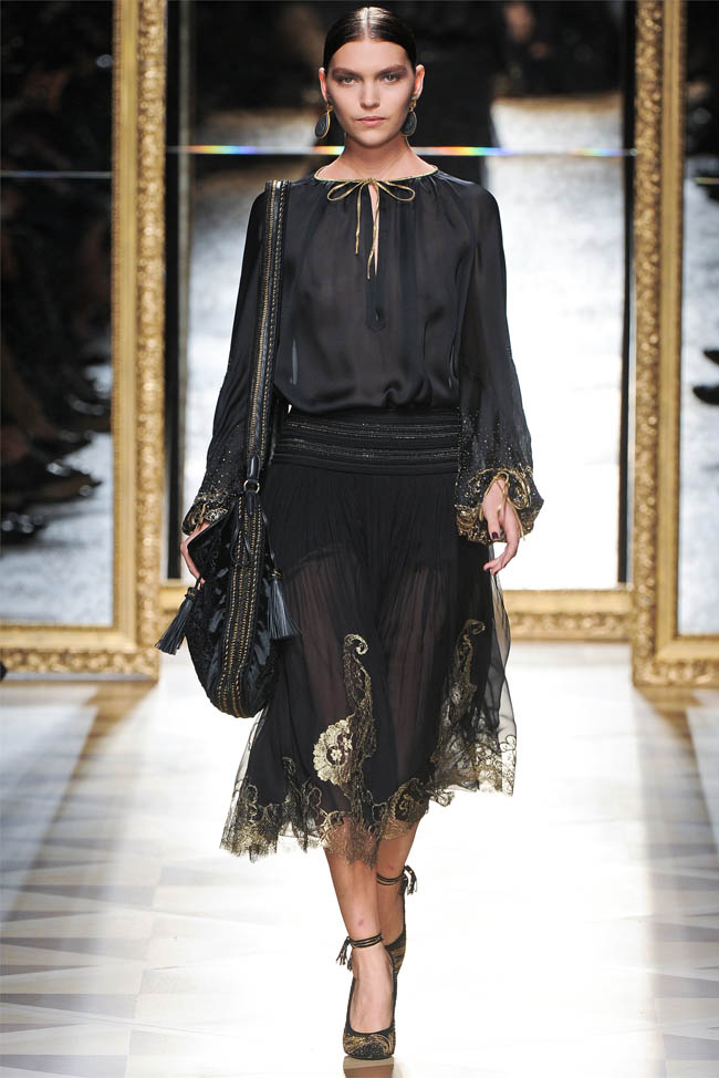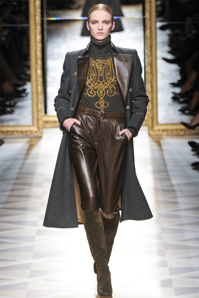Salvatore Ferragamo's Fall/Winter 2012/2013 womenswear fashion show in Milan's Women's Fashion Week started with a parade of gold-buttoned double-breasted military coats and ended in a waltz of romantic evening gowns.