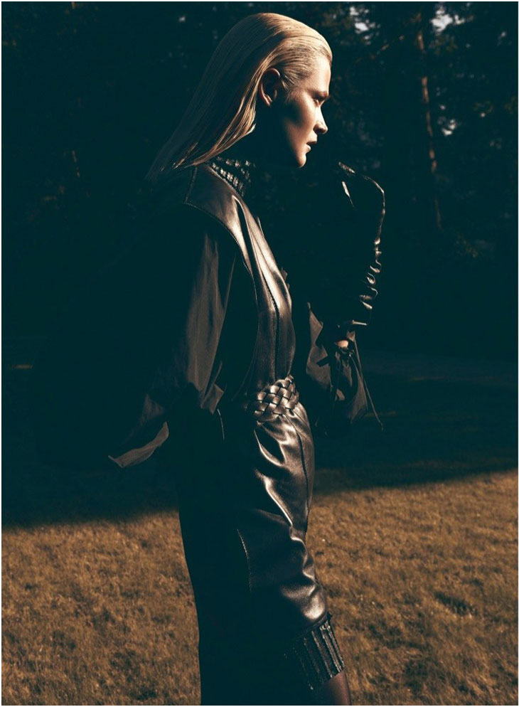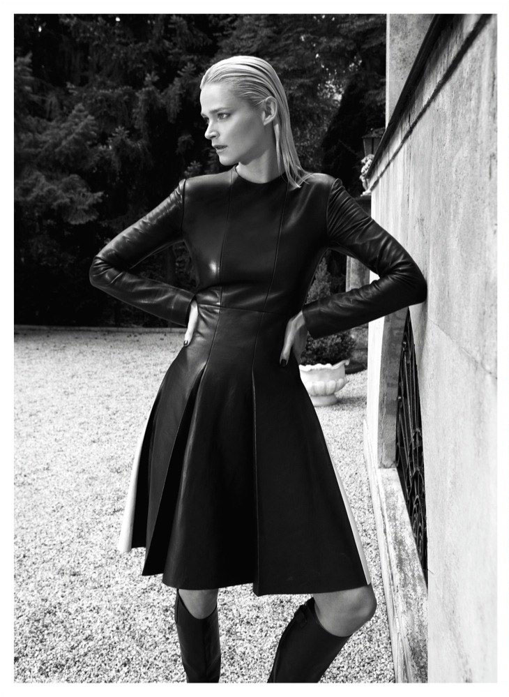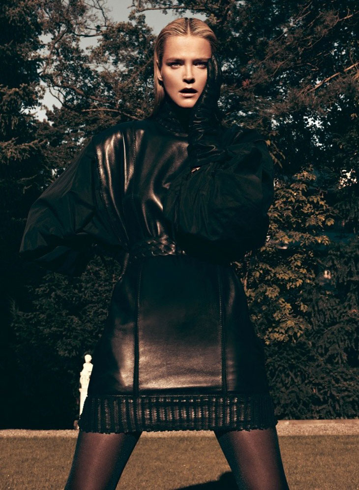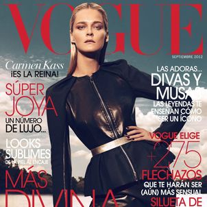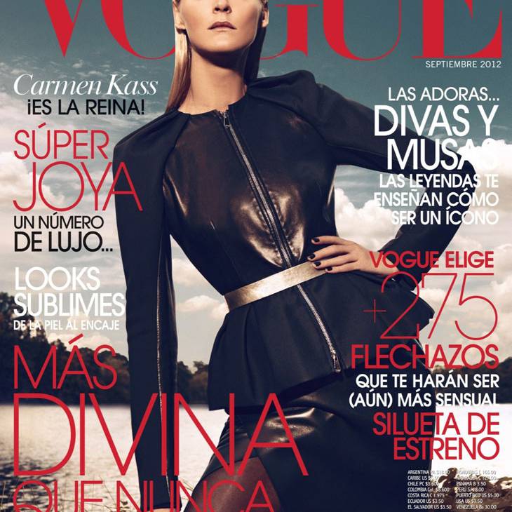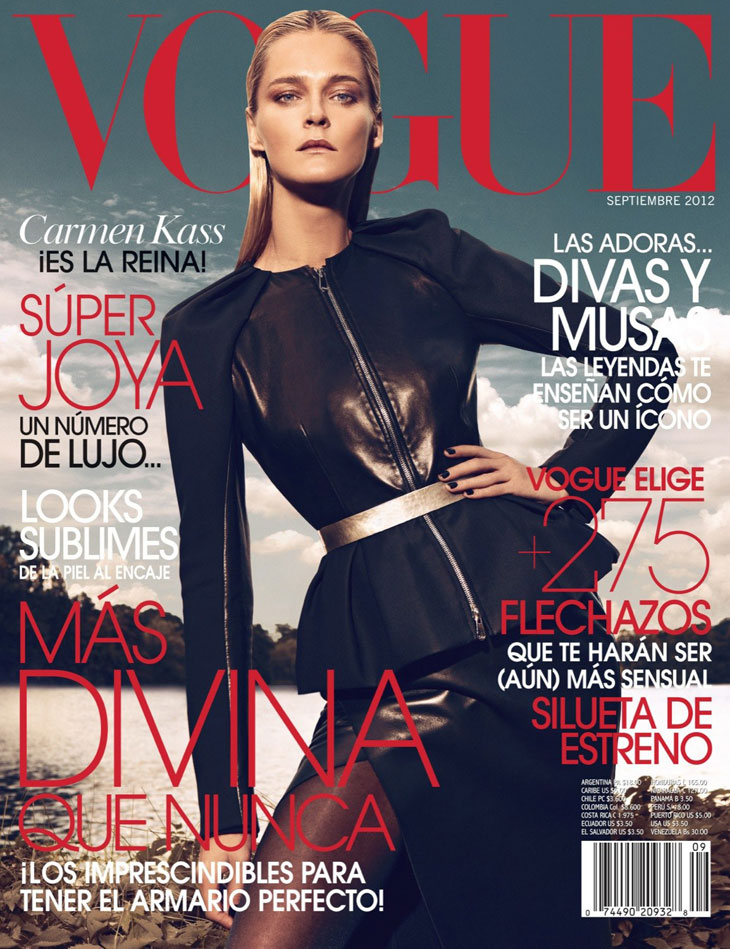 The September issue of Vogue Latin America taps Carmen Kass for a cover story of strict glamour lensed by Koray Birand. Stylist Sarah Gore Reeves selects black pieces from the autumn collections of Guy Laroche, Lanvin, Costume National and Miu Miu amongst others for the slick, outdoor images. Luminous makeup by Ali Riza Ozdemir and sleek hair by Ali Yilanci offer a powerful look for the Estonian beauty.