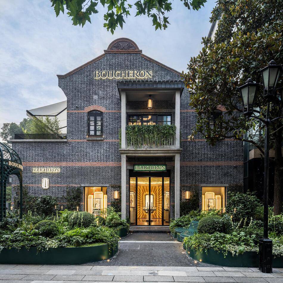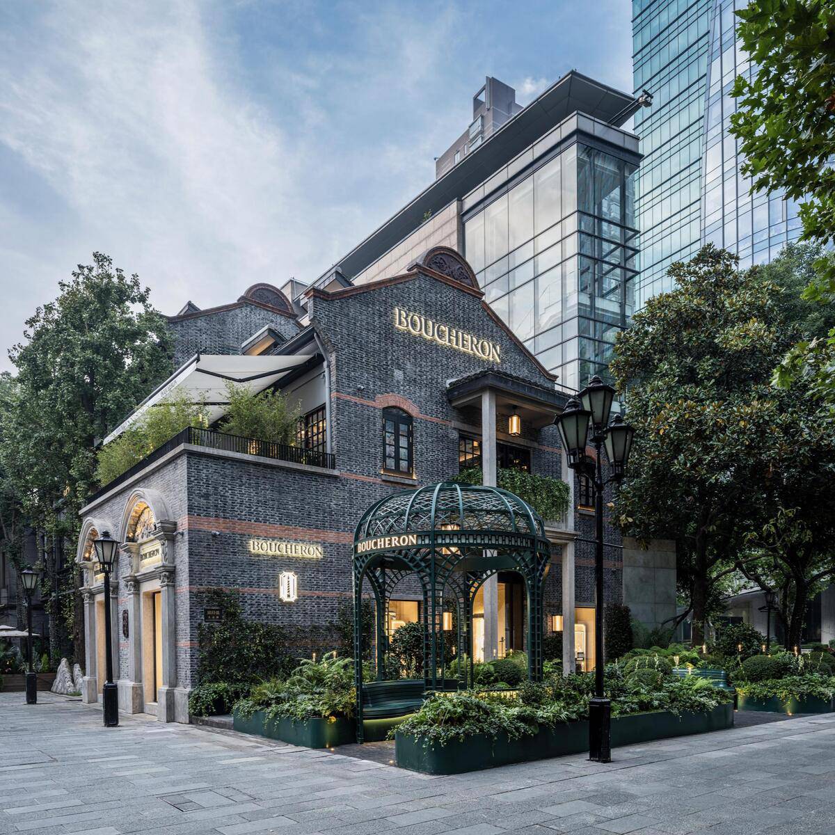 True to Boucheron's DNA, nature is the protagonist here. The boutique serves as a verdant oasis in downtown Shanghai, featuring a French winter garden that echoes the glass conservatories of 19th-century Europe. This Western botanical nod is balanced by a secondary entrance honoring classical Chinese gardens, complete with a traditional Moon Gate and flowing water features.