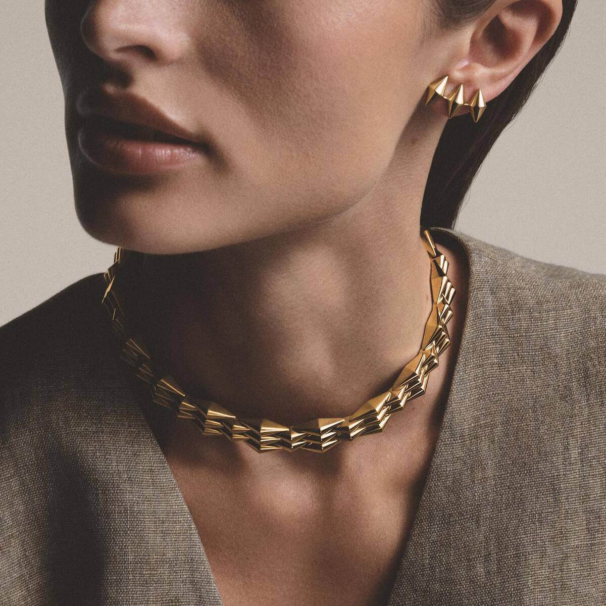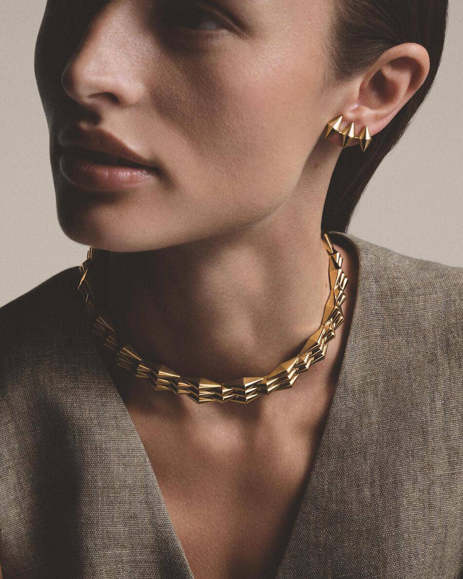 This new collection includes five main jewelry pieces: a necklace, bracelet, ring, and two types of earrings. Each one is crafted in warm yellow or rose gold, which is a signature of the brand’s identity. The bracelet is designed to wrap around the wrist like a golden wave, using invisible links to make the gold feel fluid and comfortable against the skin.