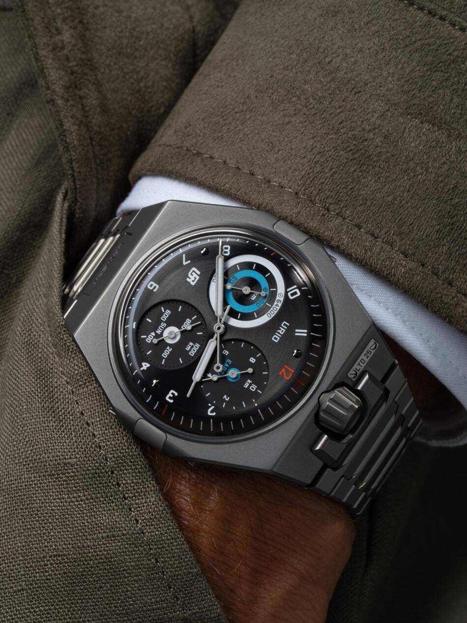 On the wrist, the UR-10 performs a similar magic trick, using three elegant sub-dials to track our progress through the cosmos. At two o’clock, a counter follows the Earth’s daily rotation, while the indications at four and nine o’clock monitor our steady journey around the sun.