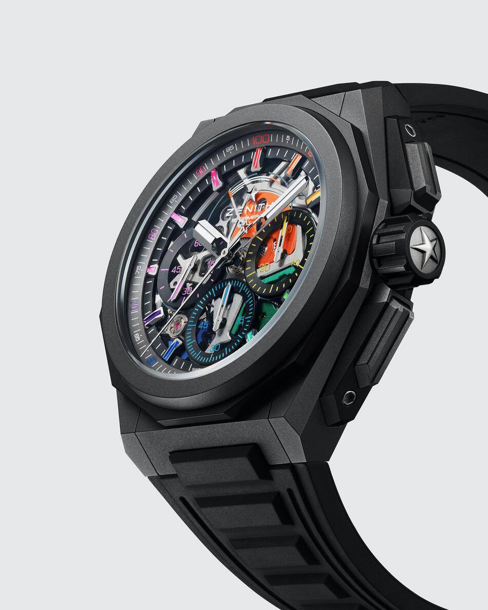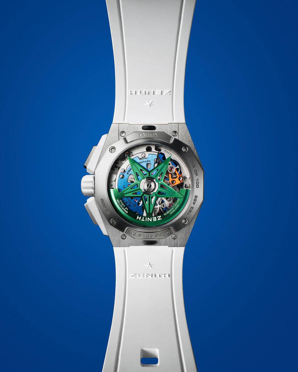Turning the watch over reveals yet another layer of design sophistication. The transparent case back displays Zenith’s signature star-shaped rotor, which is rendered in a striking electric blue for the black edition and a vivid green for the white model. Beyond its aesthetic prowess, the watch is a technical marvel capable of measuring elapsed time with 1/100th of a second precision.