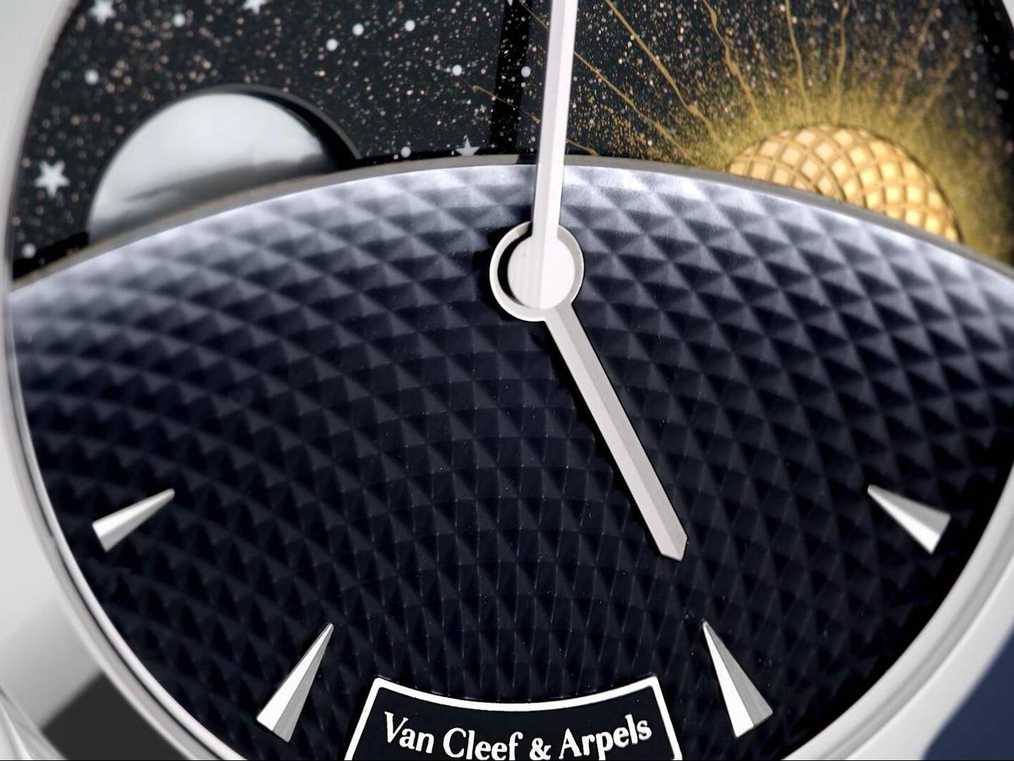 Van Cleef & Arpels is expanding its Jour Nuit collection with the introduction of a new creation in honor of the Moon, a long-standing source of inspiration for the Maison. The watch features two overlapping complications housed within a 42 mm white gold case. The first animates the eponymous Jour/Nuit display, while the second astronomical complication illustrates the current Moon phase.