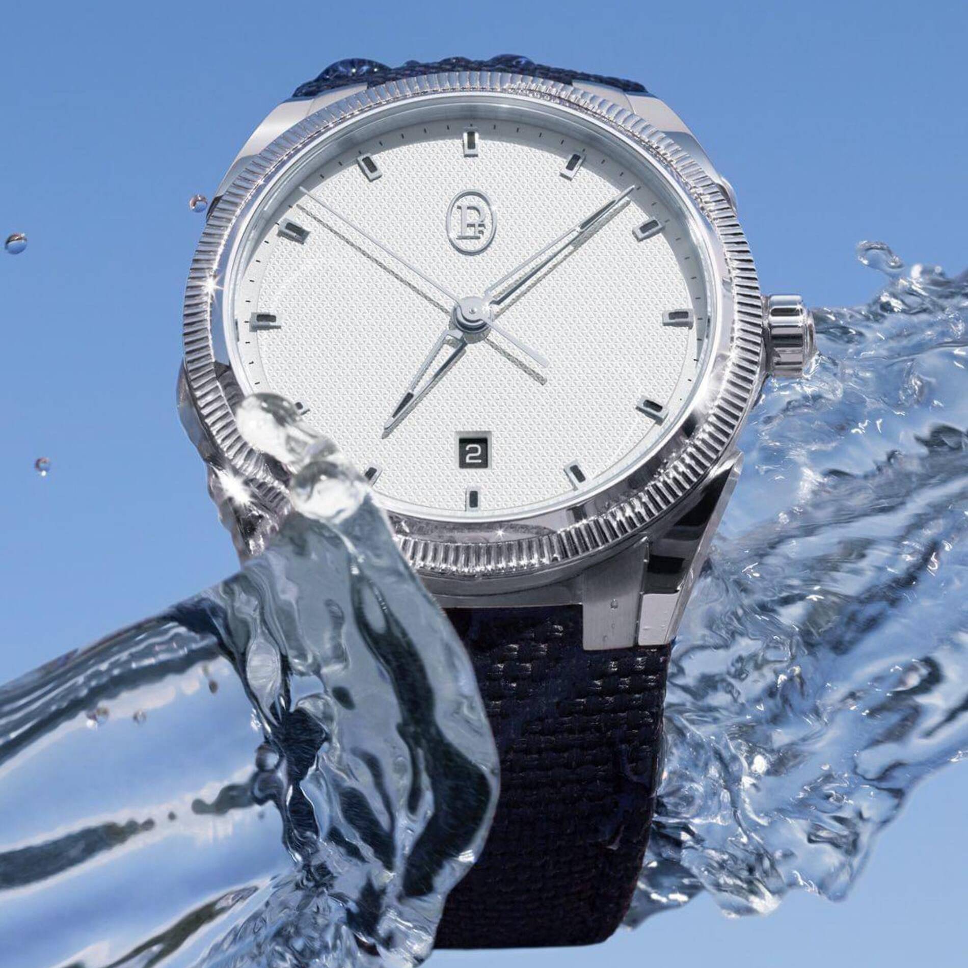 The textured strap is Cordura-treated rubber, handcrafted and stitched; its anchorage point between the lugs is so seamless that it gives the impression of being integrated into the case. Both watches are water-resistant to 100 metres.