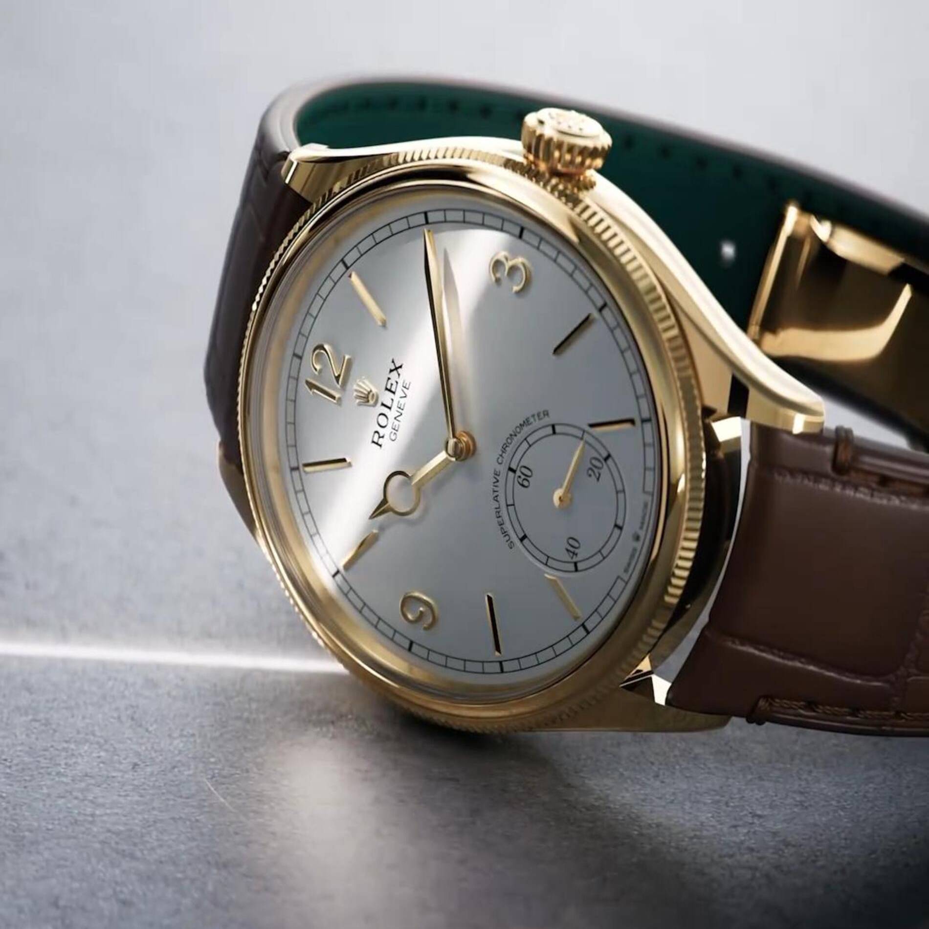 The elegant and understated Rolex Oyster 1908 features a slim case crowned with a bezel that is part domed and part finely fluted. In 18ct gold, the case features a transparent back that allows the movement’s technical sophistication and decoration to be admired.